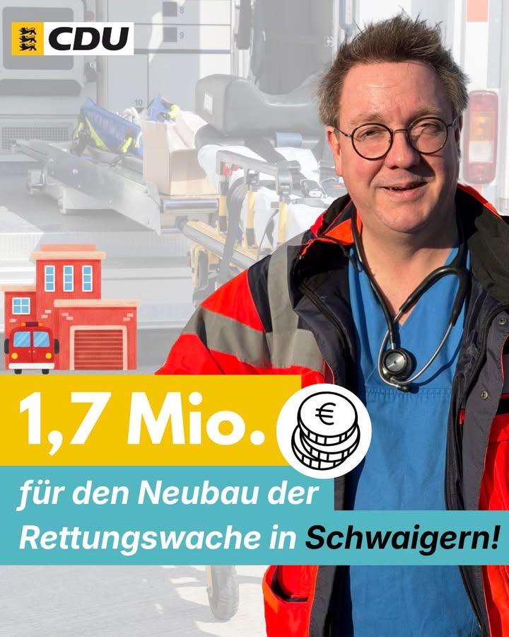 🚑 Herausragende Nachrichten für #Schwaigern und die Region: 1.696.230 ? Fördermittel fließen in den Neubau der #Rettungswache in Schwaigern! 💶?Ich freue mich sehr, dass sich mein beharrlicher Einsatz beim Innenministerium damit ausgezahlt hat. 🙌🏥 Als Notfallmediziner und Landtagsabgeordneter weiß ich aus eigener Erfahrung, wie entscheidend moderne Rettungswachen für schnelle und verlässliche Hilfe im Ernstfall sind. ⏱️❤️Die landesweit freigegebenen über 62 Mio. ? sind ein starkes Signal: Wir bauen den Förderstau ab und stärken den Rettungsdienst nachhaltig und in der Breite. 💪Ein wichtiger Beitrag für Sicherheit, gute Versorgung und starke Einsatzkräfte vor Ort! 🚨👏
